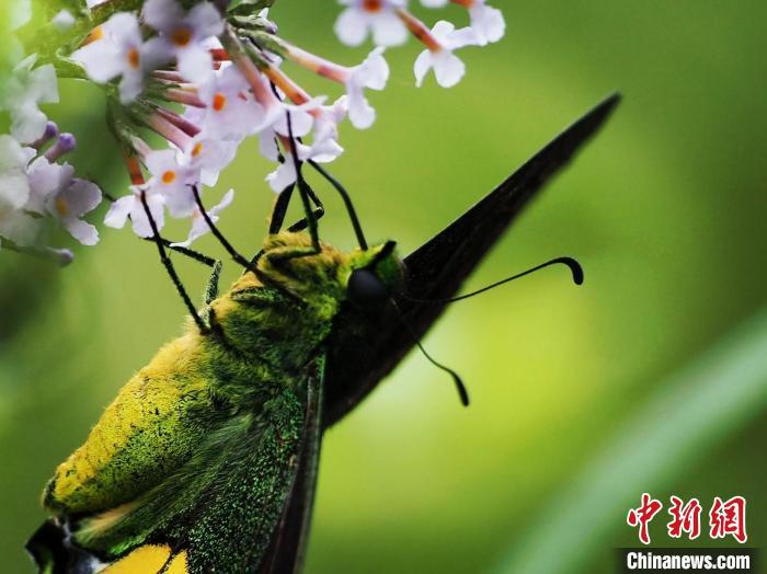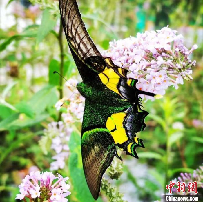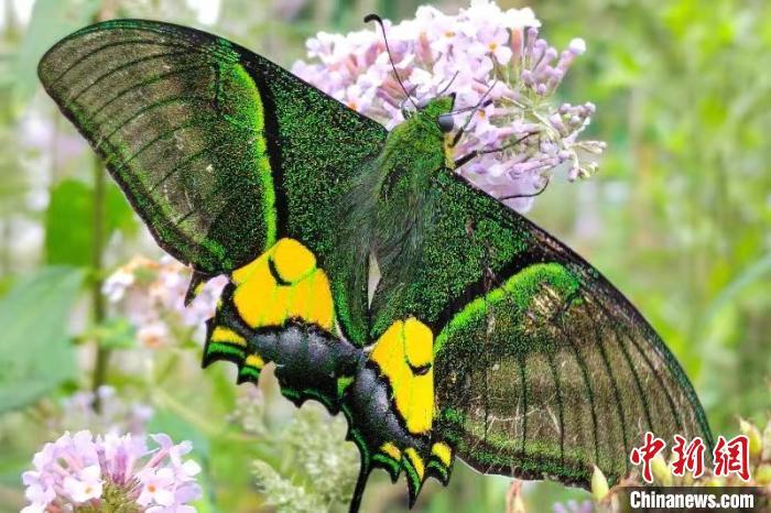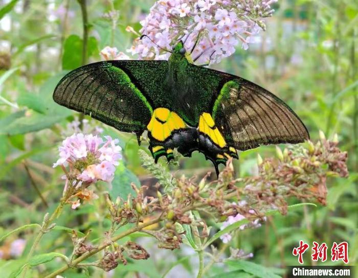 中新网河池8月29日电(黄香菊 莫兰厦)广西九万山国家级自然保护区29日介绍,该保护区巡护员近日在日常巡护返回途中,发现路边草丛上有一只不同寻常的蝴蝶。后经昆虫专家鉴定,确认该蝴蝶为国家一级保护动物金斑喙凤蝶的雄性个体。