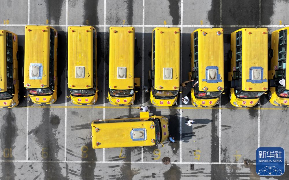 8月29日,江苏省淮安市洪泽区校车公司工作人员对校车进行安全检查(无人机照片)。新华社发(殷潮摄)
