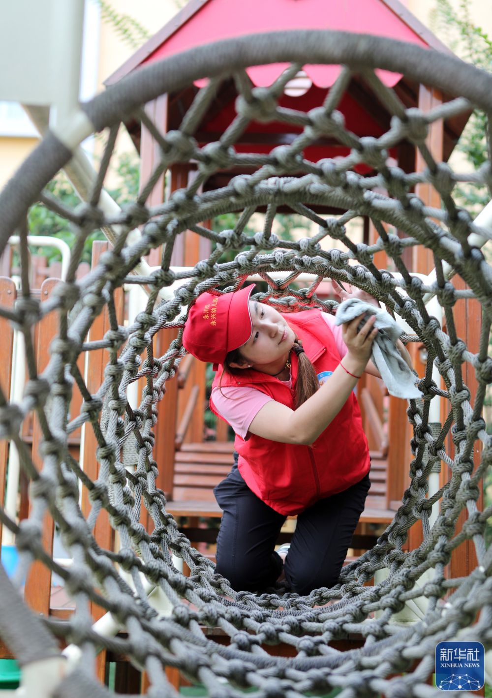 8月29日,在湖南省永州市江永县中心幼儿园,教工对活动器材进行清洁消毒。新华社发(田如瑞摄)