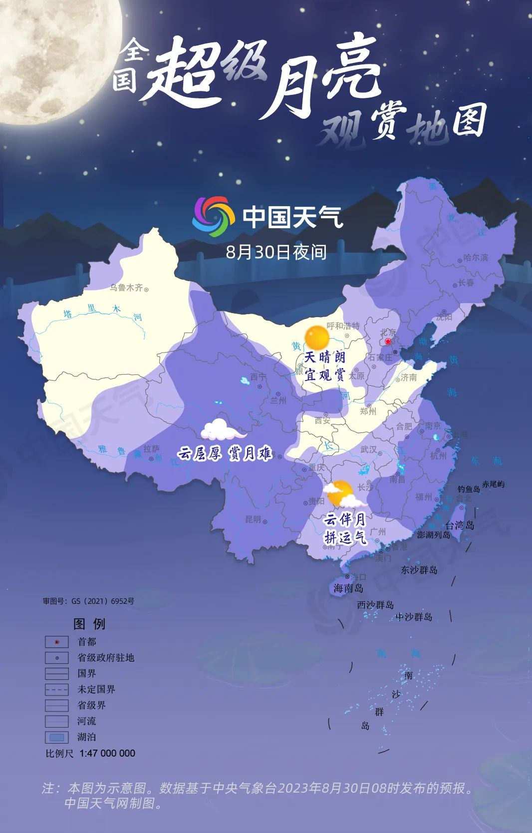 河北西部、湖南、广西、广东等地天空云量较多,呈现云伴月景象。这个区域中的武汉、长沙、南宁、广州等城市,赏圆月要拼运气,但能看到月光云影共徘徊也别有一番意境。