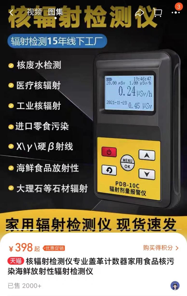 某品牌的核辐射检测仪宣称可以检测核废水、医疗核辐射、进口零食污染、海鲜食品放射性、大理石等石材辐射。记者咨询该品牌客服,对方表示,这两天的销量都很大,有的型号已经“爆单”了。