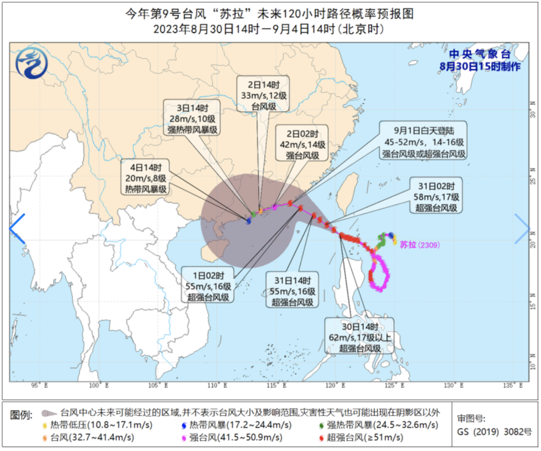 中央气象台预计,“苏拉”将以每小时10—15公里的速度向西北方向移动,于8月30日夜间或8月31日凌晨移入南海东北部海面,逐渐向广东东部到福建南部一带沿海靠近,有可能于9月1日白天在上述沿海登陆 (强台风级或超强台风级,45—52米/秒,14—16级),也有可能在广东东部近岸海面向西偏南方向移动。