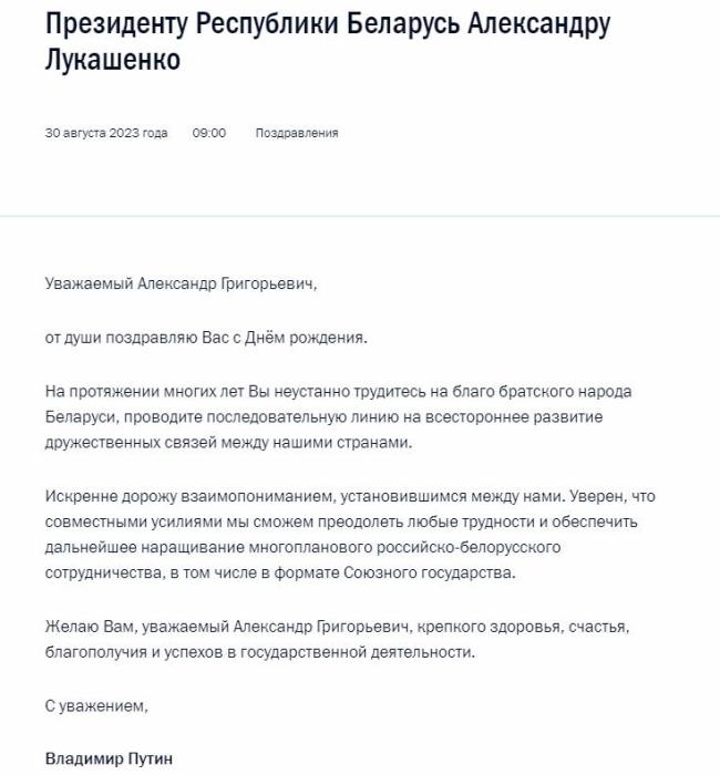 普京给卢卡申科的生日贺电。图片来源:克里姆林宫官网