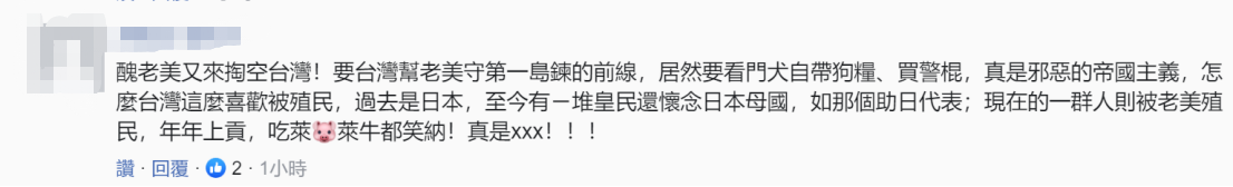 也有网友痛批,“丑老美又来掏空台湾!要台湾帮老美守第一岛链的前线,居然要看门犬自带狗粮、买警棍,真是邪恶的帝国主义,怎么台湾这么喜欢被殖民,过去是日本,至今有一堆皇民还怀念日本母国,如那个助日代表;现在的一群人则被老美殖民,年年上贡,吃莱猪莱牛都笑纳!”↓
