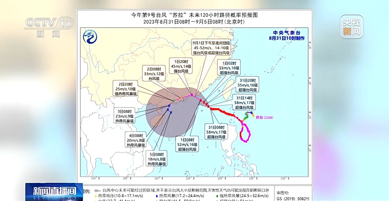 中央气象台今天10时继续发布台风红色预警:今年第9号台风“苏拉”(超强台风级)已于昨天(30日)晚上移入南海东北部海面。今天11时,距离广东省汕尾市东南方向约320公里,中心附近最大风力有17级。