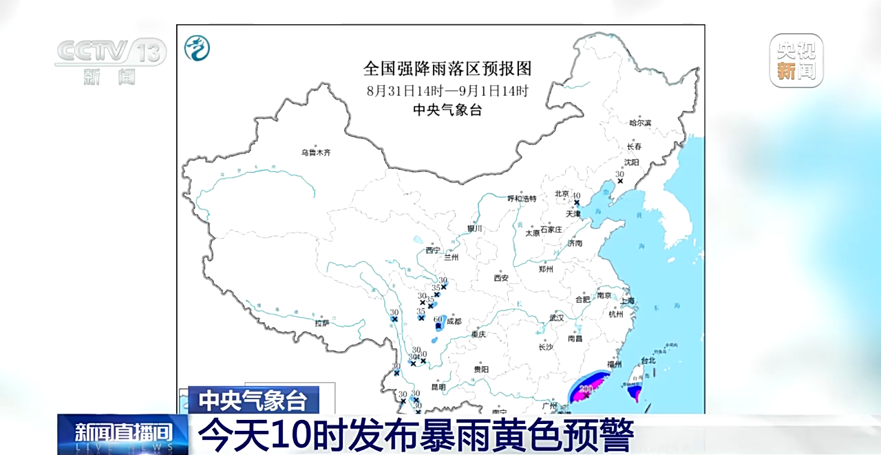 另外,受台风和南下冷空气共同影响,中央气象台今天10时发布暴雨黄色预警:预计,今天14时至9月1日14时,广东东部、福建南部和台湾岛中南部等地的部分地区有大到暴雨,其中,广东东南部、福建东南部、台湾岛东南部等地部分地区有大暴雨。上述部分地区伴有短时强降水,局地有雷暴大风等强对流天气。