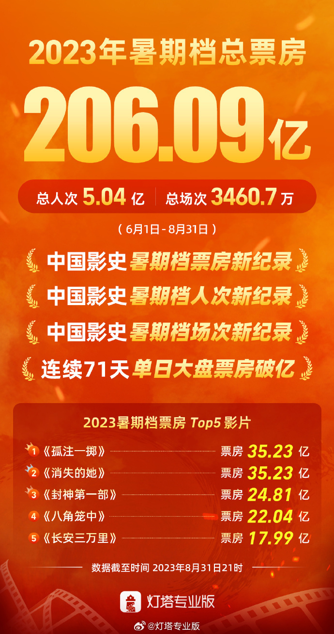2023年暑期档即将正式收官。据灯塔专业版,截至8月31日21时,2023年暑期档(6月1日-8月31日)粗报票房206.09亿,远超此前最高纪录的177亿元。同时,总观影人次也达到5.04亿,总场次3460.7万,均创中国影史暑期档新纪录。