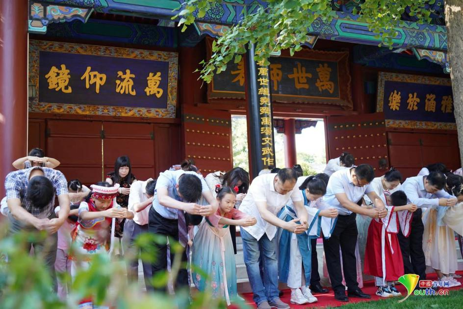 “一拜孺子启蒙,青云有路,鱼水化龙。 二拜德蒙先庇,先圣之道,功过古今。三拜格物致知,修身治齐,自强不息......”伴随着司仪的口令和舒缓雅致的礼乐,学生们在家长的陪伴下穿过大成门,在孔子像前礼拜先师孔子。