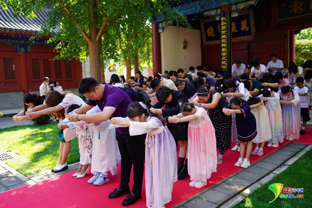 仪式上,不少家长和孩子一起穿汉服、行古礼,陪伴孩子共度求学路上的难忘时刻。四年级二班学生薛诗朗的家长和孩子穿起了“亲子汉服装”。“孩子今天特别激动,今天我陪着孩子全流程体验了‘入泮礼’仪式,感受到了学校在教导孩子们传承中华优秀传统文化方面的用心。相信通过这个活动,孩子们对于国学、传统文化会有更深刻的体会,充满文化自信,成为一名优秀的传统文化传承者。”这位家长说。