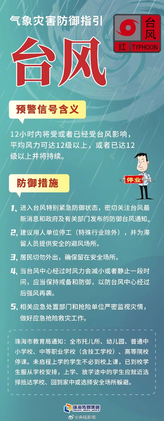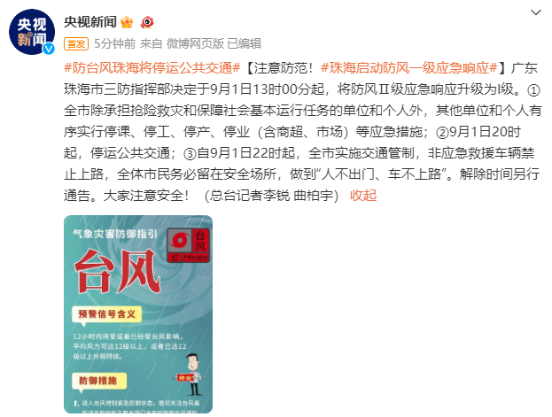 【注意防范!珠海启动防风一级应急响应】广东珠海市三防指挥部决定于9月1日13时00分起,将防风Ⅱ级应急响应升级为I级。①全市除承担抢险救灾和保障社会基本运行任务的单位和个人外,其他单位和个人有序实行停课、停工、停产、停业(含商超、市场)等应急措施;②9月1日20时起,停运公共交通;③自9月1日22时起,全市实施交通管制,非应急救援车辆禁止上路,全体市民务必留在安全场所,做到“人不出门、车不上路”。解除时间另行通告。大家注意安全!(总台记者李锐 曲柏宇)