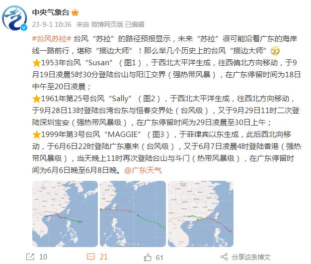 台风“苏拉”的路径预报显示,未来“苏拉”很可能沿着广东的海岸线一路前行,堪称“描边大师”!那么举几个历史上的台风“描边大师”。