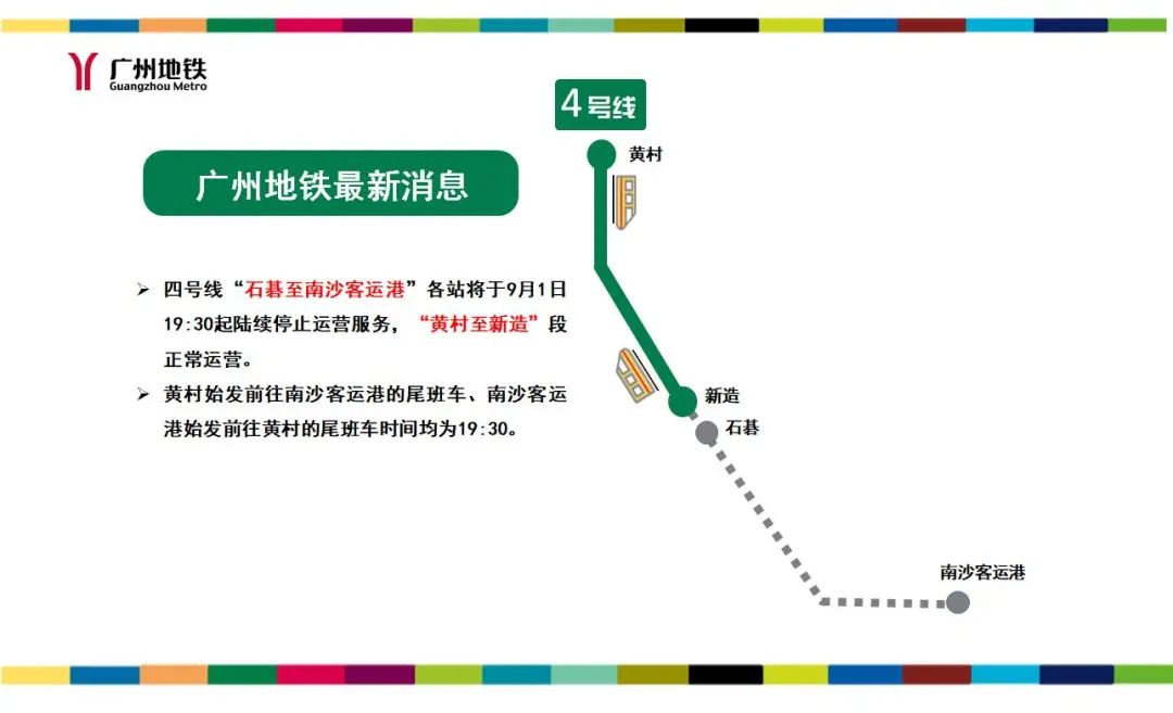据广州地铁9月1日消息,受台风“苏拉”影响,为保障乘客出行安全,广州地铁四号线“石碁至南沙客运港”各站将于9月1日19:30起陆续停止运营服务 ,即黄村始发前往南沙客运港的尾班车、南沙客运港始发前往黄村的尾班车时间均为19:30,“黄村至新造”段正常运营。