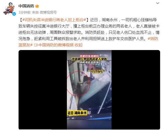 近日,湖南永州,一司机粗心挂错档导致车辆失控径直冲进银行大厅,撞上柜台前正办理业务的两名老人,老人直接被卡进柜台无法动弹,周围群众报警求助。消防员赶赴,只见老人伤口处血流不止,情况危急,赶紧利用工具破拆救出老人并利用担架送上救护车交由医护人员。