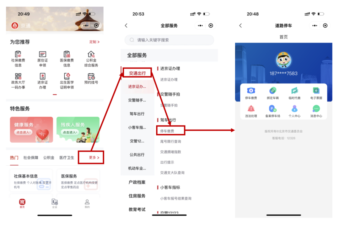 停车缴费。 路侧停车如何缴费?您可在“京通”首页搜索或在“全部服务-交通出行-停车缴费”中使用该服务,通过绑定车辆信息,及时获取路侧停车订单并缴费。另外,您还可以通过该服务帮助他人临时代缴停车费用、开具电子票据、处理违法订单等。