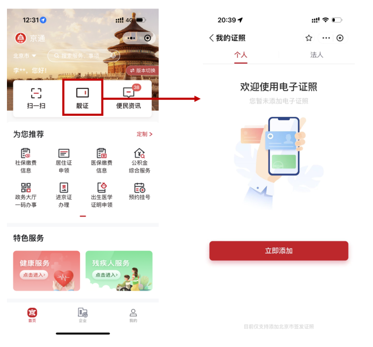 为向更多用户群体提供服务,“京通”小程序新增了港澳通行证、台湾通行证、港澳居住证、台湾居住证、外国人永居证、华侨护照及外国护照7类证件的认证功能,持有相关证件的用户也可登录“京通”小程序使用相关服务。