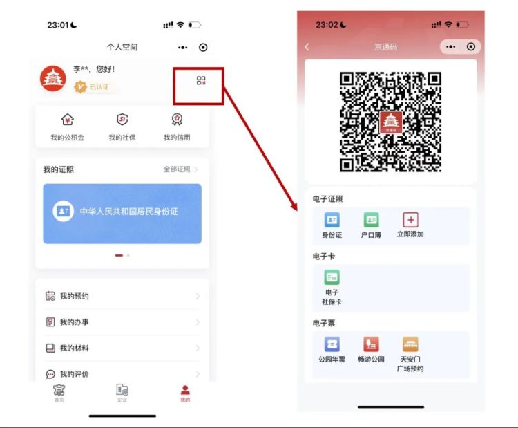 为便捷市民日常生活,“京通”小程序设计推出“京通码”功能,“京通码”汇聚了用户常用的居民身份证、居民户口簿等电子证照以及电子社保卡、医保电子凭证、公园年票、天安门广场预约等,实现了个人“码、证、卡、票”的集成展示。