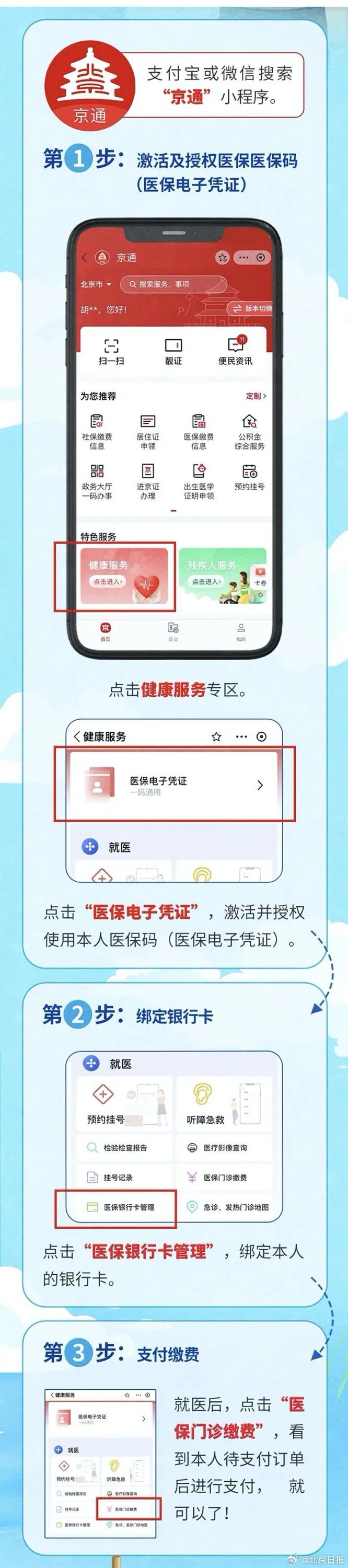 具体开通流程是:在支付宝、微信中搜索“京通”小程序,点击“健康服务”,选择“医保电子凭证”“医保银行卡管理”分别注册激活医保电子凭证、绑定银行卡。就诊后点击“医保门诊缴费”,即可在线完成门诊费用的医保报销缴费。