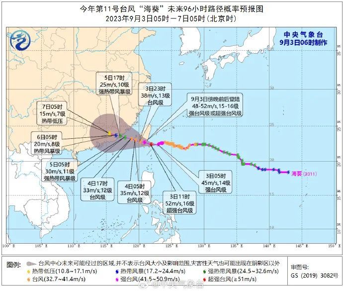 据气象部门预报,2日23时今年第11号台风“海葵”(强台风级)中心位于汕头偏东方约710公里的西北太平洋洋面上。预计,“海葵”将以每小时15到20公里的速度向偏西方向移动,强度逐渐增强,最强可达超强台风级(16级),将于3日傍晚前后在台湾岛东南部沿海登陆,然后穿过台湾岛,逐渐向福建南部到广东东部沿海靠近。中央气象台9月3日06时继续发布台风红色预警。汕头市气象台于2023年9月3日10时12分将台风白色预警信号升级为台风蓝色预警信号。全市地质灾害气象风险Ⅲ级预警正在生效中。