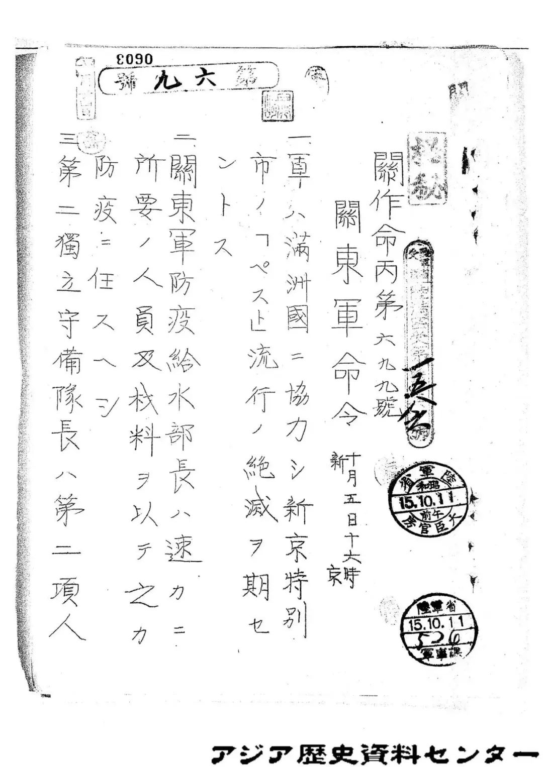 日本关东军司令部于1940年10月5日下发了一份“关作命丙第699号命令”文件,其命令规定,“关东军防疫给水部部长速以所需人员和材料担任防疫”;驻“新京”的第二独立守备队负责防疫的“宿营”,“新京”陆军病院、关东军野战汽车厂、关东军陆军仓库“协助防疫队”;哈尔滨第一陆军病院为援助诊疗业务向长春派人。