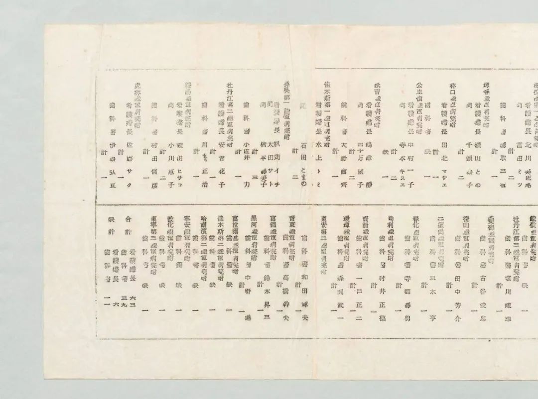 其中,院长是军医少将,由大佐,中佐、少佐、大尉、中尉、少尉等组成,基本上勾勒了日军哈尔滨第一陆军病院编制设置及人员构成的整体形态。同《哈尔滨第一陆军病院原簿》相比,这份档案,记载了侵华日军哈尔滨第一陆军病院在1941年7月16日正式编成之前的高等文官任职情况,这是在以往档案中不曾发现的。这份档案的发现,是深化日军哈尔滨第一陆军病院的整体形态与机构编制问题研究的核心资料。