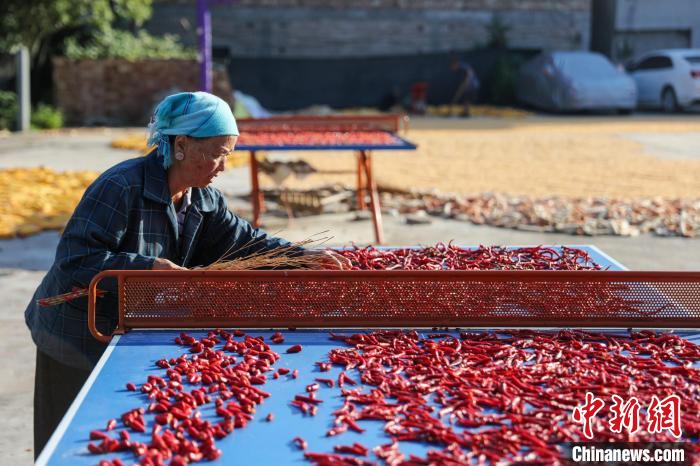 图为施秉县城关镇伍旗村村民在晾晒辣椒等农作物。磨桂宾 摄