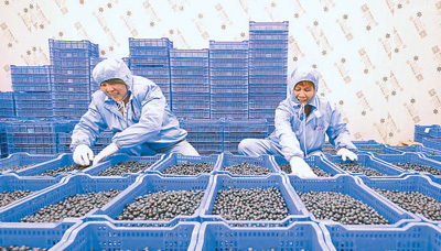 江西省抚州市东乡区孝岗镇何坊村的一家冷链公司里,工作人员正在分拣蓝莓。