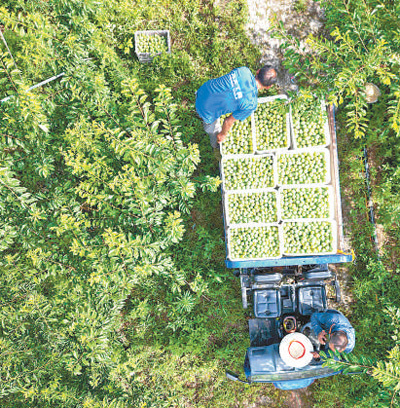 重庆市巫山县巫峡镇七星村,果农将采摘好的脆李运出果园。