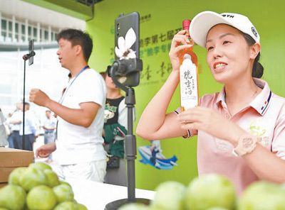 巫山脆李第七届开园节暨中国邮政航空“脆李专机”启航仪式现场,主播正在直播讲解脆李相关产品。