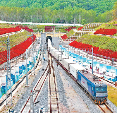 云南省西双版纳傣族自治州,装载冷链集装箱的“澜湄快线”国际货物列车驶出中老铁路友谊隧道。