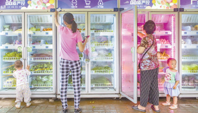 浙江省宁波市江北区甬江街道朱家苑社区,居民在社区的智能冰柜中选购果蔬。