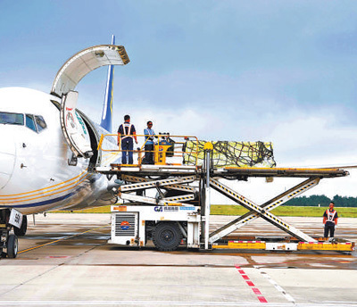 重庆巫山机场,工作人员将脆李装机。