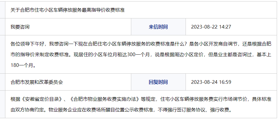 大皖新闻讯 近日,有网友在合肥12345热线留言,咨询现在合肥住宅小区车辆停放服务的收费标准是什么?是各小区开发商自调节,还是根据合肥市的指导价来制定收费标准。这位网友称,其现居住的小区车位月租达300一个月,说是根据周边小区定价,但是业主都是咨询过,基本上180一个月。