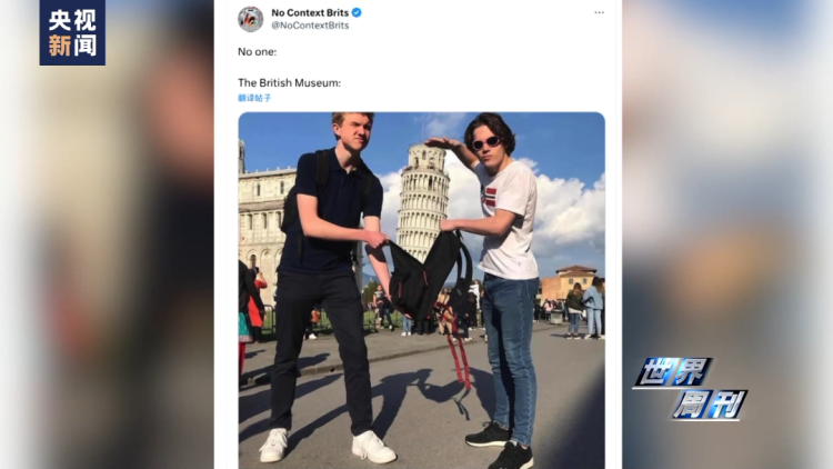 把比萨斜塔装进背包、把西班牙教堂用车拉走、把复活节岛石像当成行李带走。2022年,一名拥有百万粉丝的英国博主接连在社交媒体分享梗图,嘲讽大英博物馆在殖民时代掠夺文物。