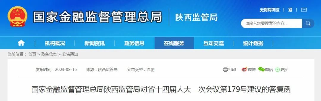 近日,国家金融监督管理总局陕西监管局发布《对省十四届人大一次会议第179号建议的答复函》。