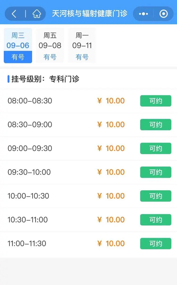 随后,记者在该院官方公众号预约查询发现,目前可预约9月6日的门诊号,挂号费为10元,挂号级别为专科门诊。