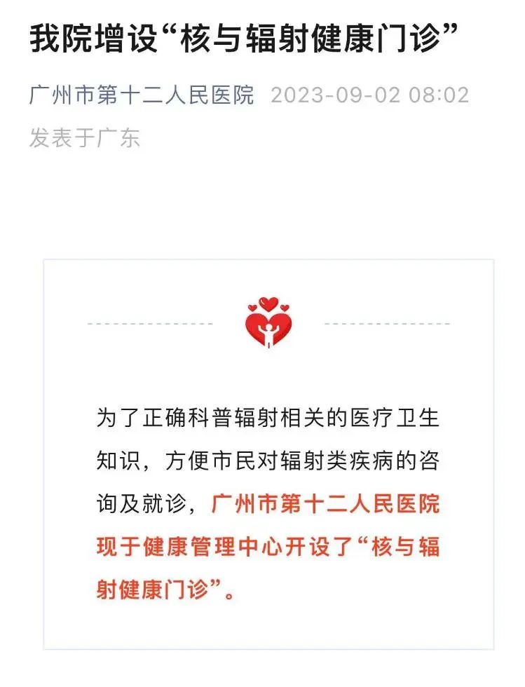 近日,广州市第十二人民医院开设“核与辐射健康门诊”的消息引发社会关注。记者在医院官方公众号查询了解到,9月2日该院发布消息称,为了正确科普辐射相关的医疗卫生知识,方便市民对辐射类疾病的咨询及就诊,医院于健康管理中心开设了“核与辐射健康门诊”。