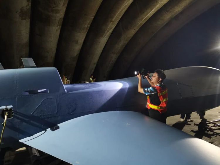 9月3日,中国气象局气象探测中心基地室主任赵培涛在现场检查海燕号Ⅰ型高空大型无人机。 来源:中国气象局气象探测中心
