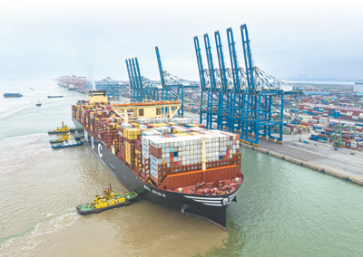 全球最大集装箱船“地中海伊琳娜”号搭载粤港澳大湾区生产的智能家电等产品出口海外。