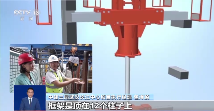 中建三局武汉长江中心项目执行经理包泽顶:整个造楼机的平台是贝雷片组成的框架梁,框架是顶在12个柱子上,12个柱子把梁顶起来,柱子往上顶的时候,梁就整体往上走。