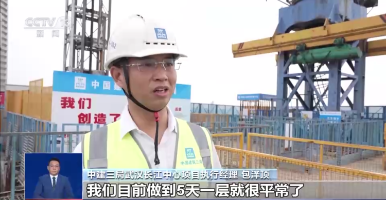 中建三局武汉长江中心项目执行经理包泽顶:常规的爬模,7天(盖)一层,相同的条件下,我们目前做到5天一层就很平常了。做得快,再抢一抢,4天也可以达到。