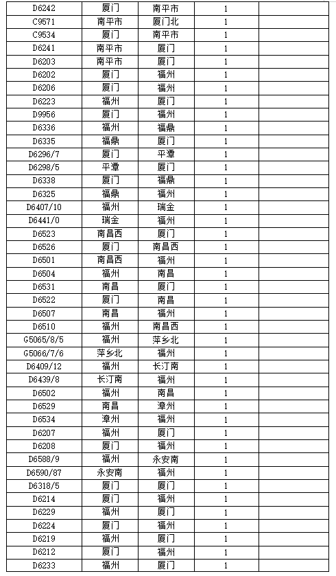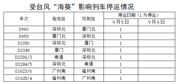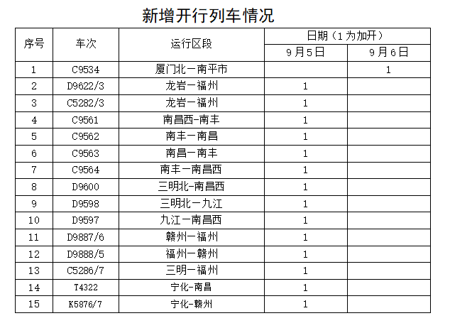 为防范台风影响,保障铁路运输安全,中国铁路南昌局集团有限公司继续调整部分旅客列车运行方案,停运管内途经杭深线福州南至诏安,龙漳线龙岩至漳州,昌福线三明北至福州等区段旅客列车。同时,加开15趟旅客列车,方便旅客出行。