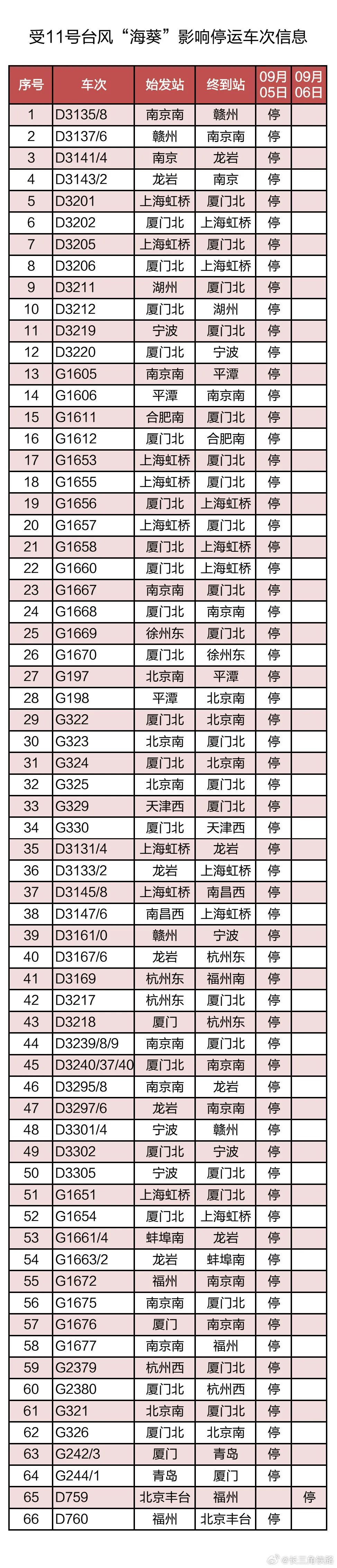 记者5日从国铁上海局获悉,今年第11号台风“海葵”今早在福建东山沿海登陆。受此影响,国铁上海局5日对65趟旅客列车采取停运措施。