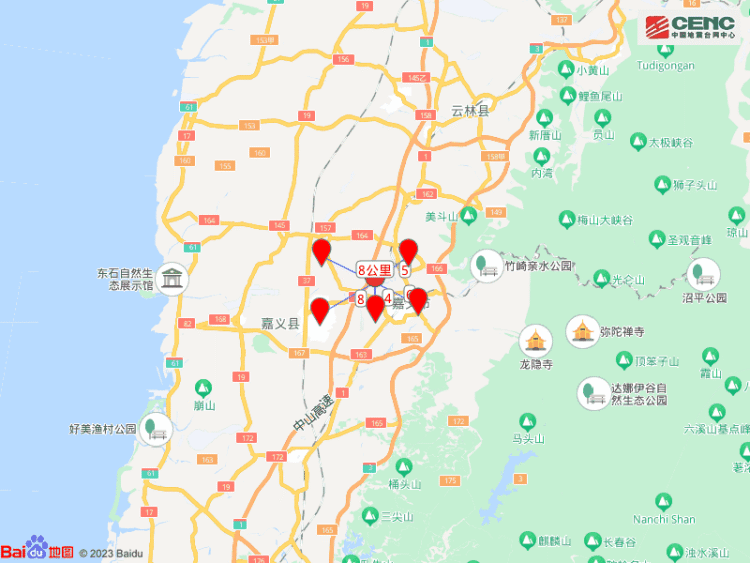 周边县城: 震中距西区4公里、距民雄乡5公里、距东区6公里、距太保市8公里、距新港乡8公里,距嘉义市4公里,距台北市206公里。