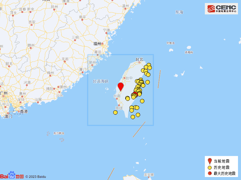 历史地震: 根据中国地震台网速报目录,震中周边200公里内近5年来发生4级以上地震共206次,最大地震是2022年9月18日在台湾花莲县发生的6.9级地震(距离本次震中99公里),按震级大小前50次历史地震分布如图。
