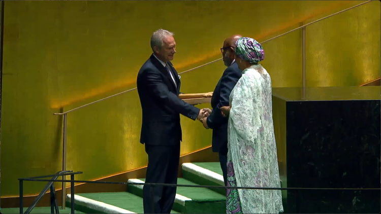 最后,克勒希感谢其团队及联合国其他部门、各成员国对他工作的支持。大会现场代表多次长时间鼓掌,表达对克勒希的感谢。随后,第78届联合国大会当选主席丹尼斯·弗朗西斯宣誓就职,并从克勒希手上接过象征联大主席的木槌,正式成为联大主席。
