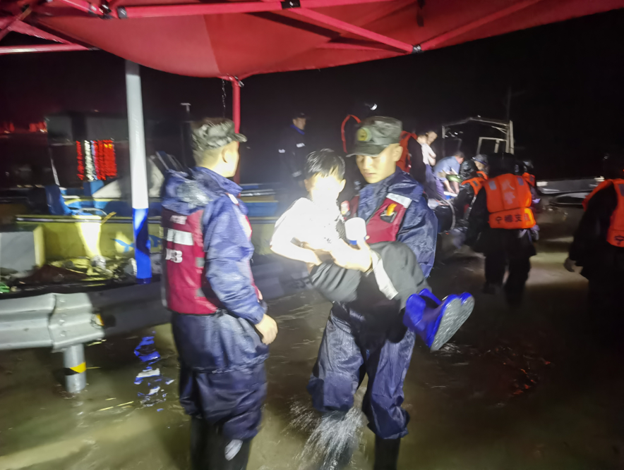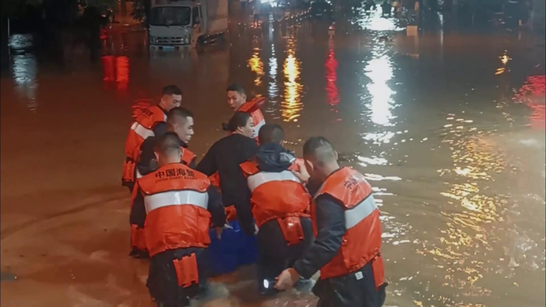 福建海警雨夜驰援,奋战防汛一线。宁德市三都镇城澳村大量民房被淹,水最深处近5米,宁德海警局救援人员将执法艇靠近房屋,利用梯子、绳索等工具保护被困群众从窗户等通道离开房屋,转运至地势较高的安全地点。