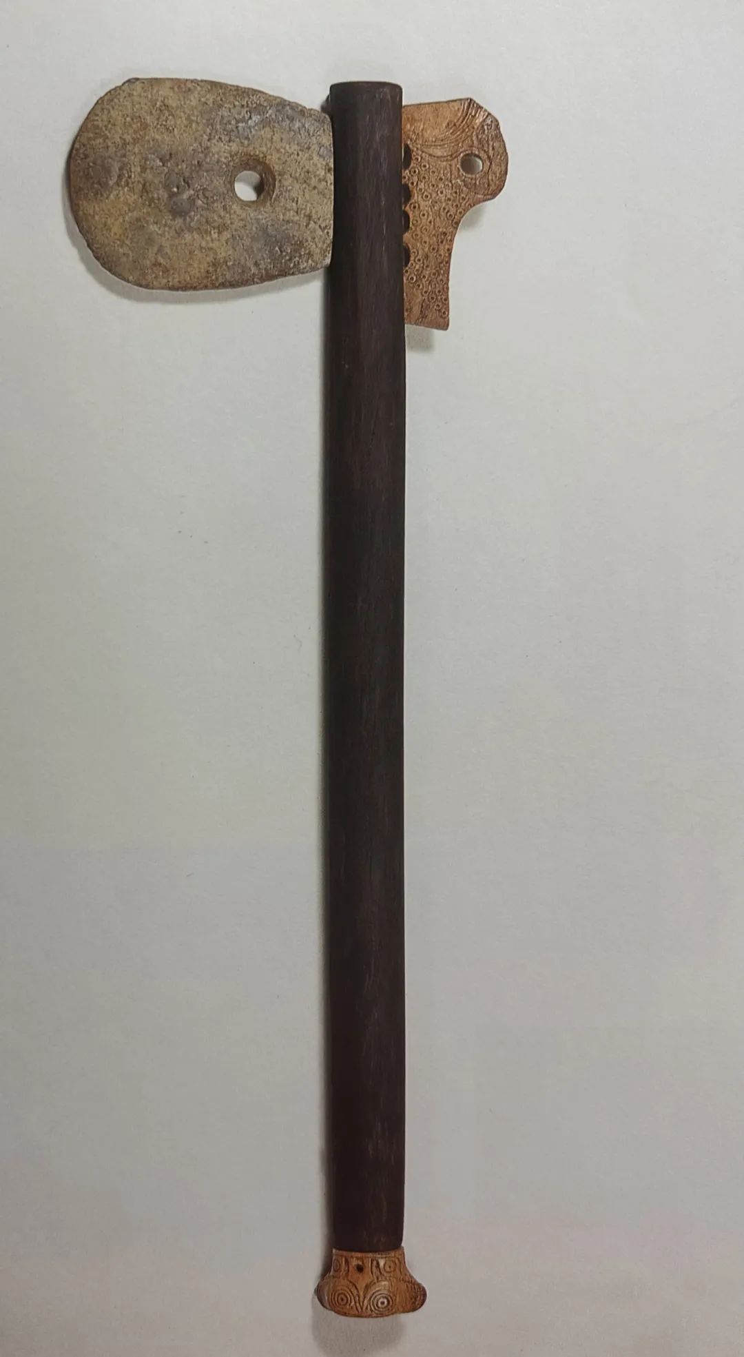 出土于第38号墓,由石钺、骨制钺帽饰、牙制墩组成,中部木柄残缺,通长53厘米。石钺灰白色、近圆形,磨制而成,上有一双面钻孔。墩为牙质,磨光,体呈鼓状,上刻四组包括同心圆钻孔等纹饰,大部分学者认为是枭(猫头鹰)。帽为骨制,上面雕刻有凹弦纹和同心圆钻孔,纹饰众说纷纭,主要有鳄鱼、大雁、鱼、蚕之说。