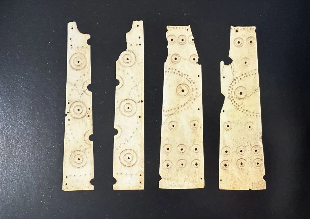 出土于墓主人左侧胸部,共4片,均用大型哺乳动物长骨制成,呈扁平薄片状,经过打磨、抛光,正、背面刻有同心圆纹以及由凹点组成的线纹,设计巧妙,布局规整。
