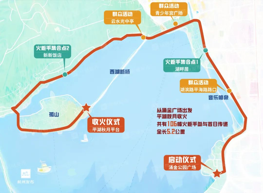 在绿意盎然的西子湖畔,向着亚运的梦想奔跑!火炬传递首日传递从杭州西湖涌金公园广场出发,沿南山路—湖滨路—环城西路—北山街—西泠桥—孤山路 传递,在“西湖十景”之一的平湖秋月收火。