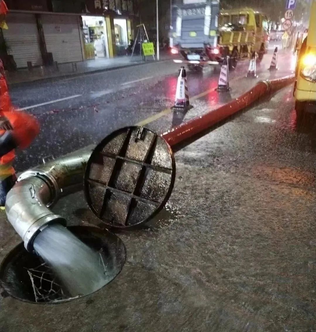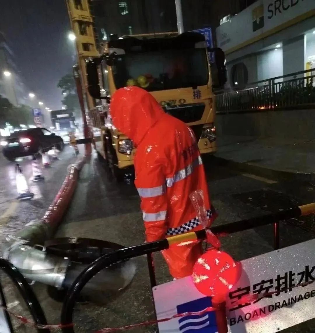 2023年9月7日晚,宝安区福围市场出现严重积水,宝排福永分公司员工开展龙吸水抽排工作。